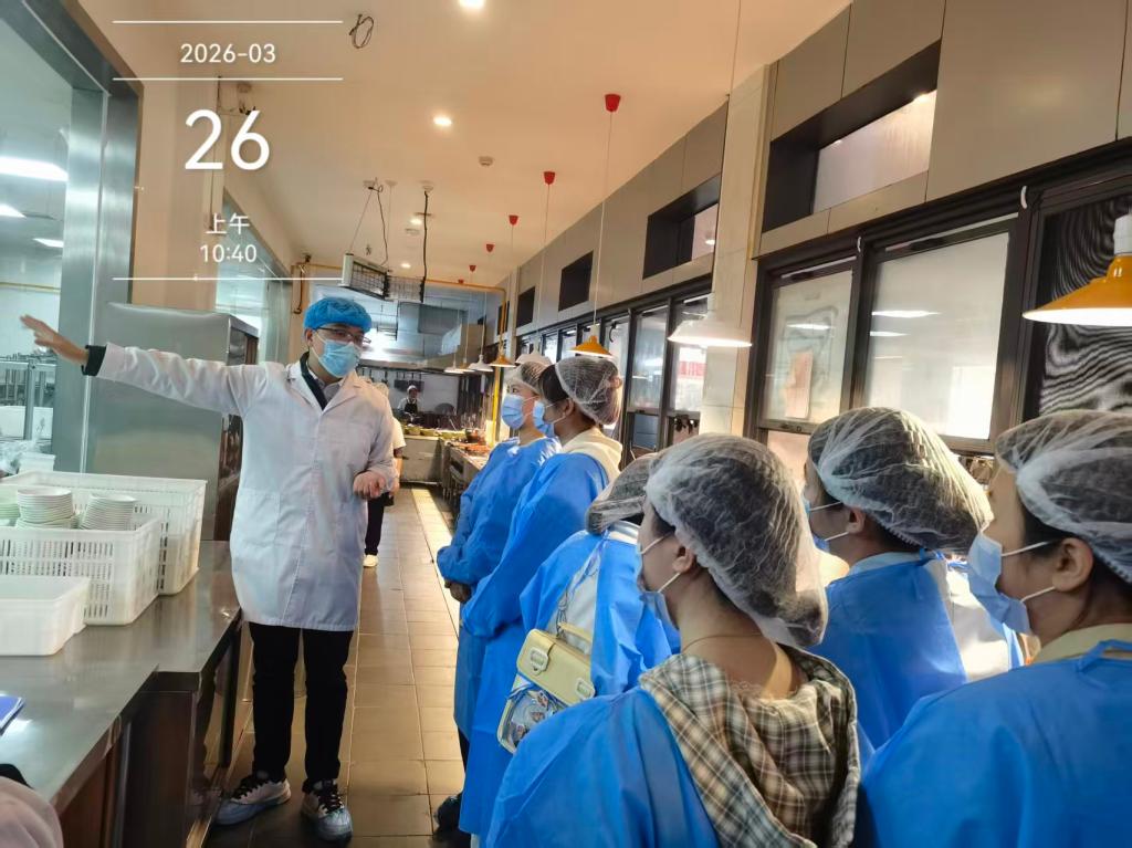 活动分为实地观摩和座谈交流两个环节。在食堂工作人员的引导下,同学们依次参观了食材储存、清洗加工、烹饪操作等区域。工作人员现场讲解了从食材采购溯源、烹饪加工到餐具消毒、食品留样的完整管理流程。食堂后厨环境整洁,操作规范严格,增强了同学们对校园食品安全的信心。