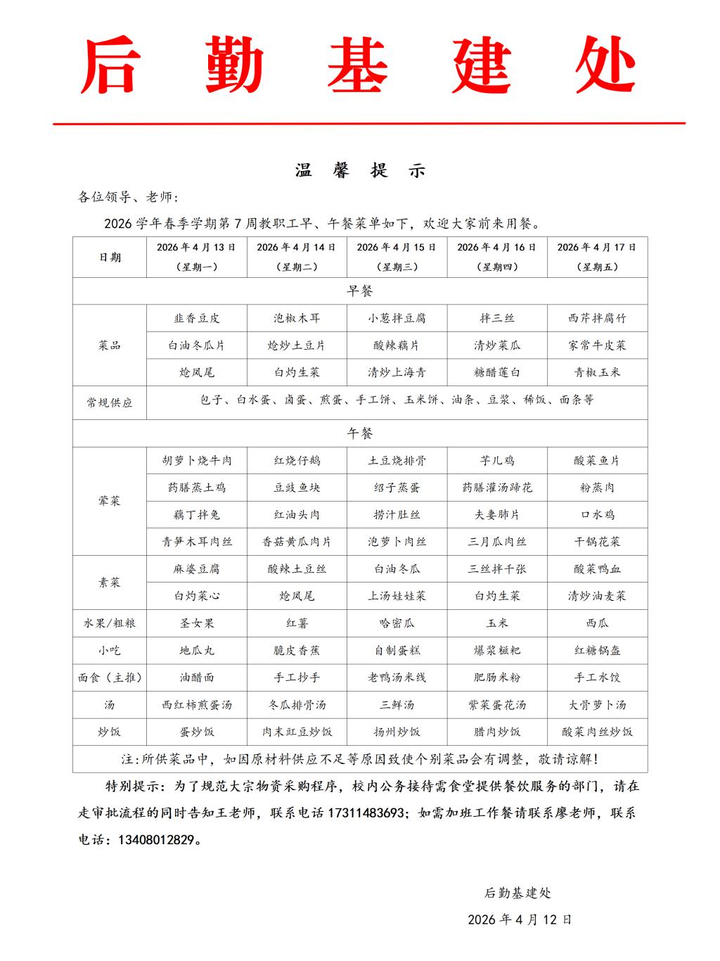 下一篇:教职工食堂2026年春季学期第6周菜单