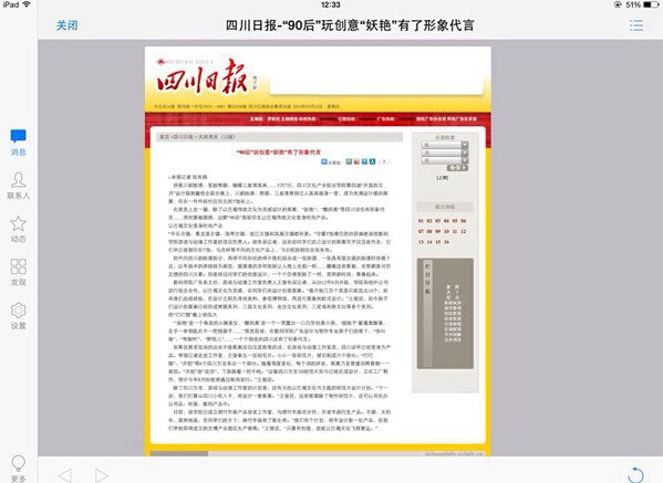 5月16日,《四川日报》第13版刊登了题为《“90后”玩创意“妖艳”有了形象代言 》一文,对我校5月7日—5月9日举办的第四届“开放的五月”设计联展暨校企联合展进行了专题报道。