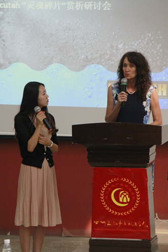 Puriri女士为师生们播放了DOCUTAH 2013年最受观众喜爱的影片——《灵魂碎片》,该纪录片讲述了南犹他地区的残疾艺术家Matt Clark进行艺术创作的故事。影片结束后,师生们感触良多,并针对艺术创作的研究与探索各方面的问题积极与Lani女士进行互动。有学生问到DOCUTAH纪录片电影节所推崇的精神和是否欢迎我校大学生投稿参加。Lani女士说:电影节推崇的不仅是对艺术生命的坚持与追求的精神,还有凡是涉及全球问题的,与世界有关的,多样化的电影制片人的精神和主旨都涵盖其中,电影节非常欢迎我校学生投稿参加。Lani女士还表示她很期待可以看到关于中国人生活方式的纪录片,无论是传统的还是现代的,她特别表示出了对中国非物质文化遗产纪录片关注的兴趣。