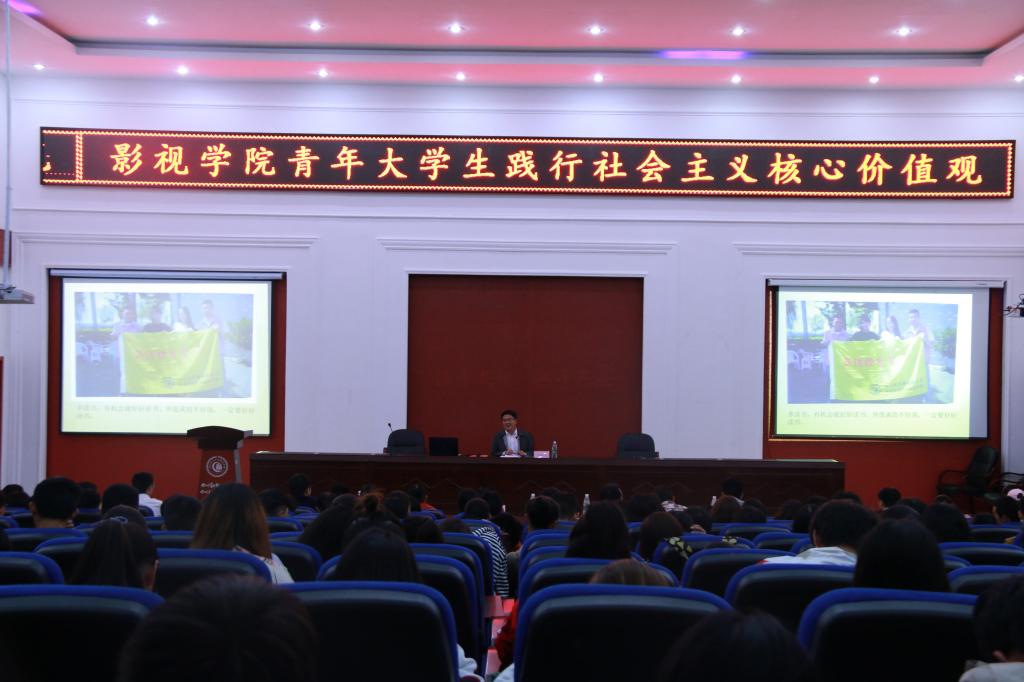 10月24日晚,影视学院在第二教学楼105举办了青年大学生践行社会主义核心价值观主题活动。我校副院长曹启富教授,学工部副部长、公寓管理中心主任唐天卿,影视学院学生科全体老师、班团学生干部以及2016年度奖助学金获得者参加了活动,活动由影视学院党总支副书记黄自立主持。