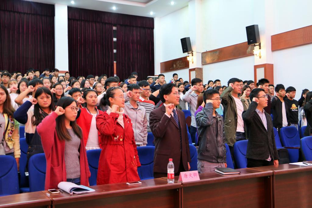 在动漫学院学生会主席陈静的领誓下,全体学生高举右手进行庄严宣誓,表示要自觉按照“勤学、修德、明辨、笃实”的要求锤炼自己、提高自己,做到志存高远、德才并重、情理兼修、勇于开拓,在火热的青春中放飞人生梦想,在拼搏的青春中成就事业华章。