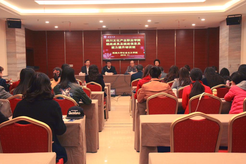 为认真贯彻中央统战工作会议,特别是习近平总书记重要讲话精神,全面落实《中国共产党员统一战线工作条例(试行)》,推进我校统战及宣传工作,11月3日至5日,我校在西南大学社会主义学院举办了2016年统战成员及宣传干事能力提升培训班。西南大学党委常委、党办主任罗朝明,我校党委委员、副院长曹启富,西南大学统战部部长周文全等领导出席培训开班仪式,开班仪式由周文全主持。我校职能部门及二级学院的统战成员和宣传干事共计35人参加了此次培训。