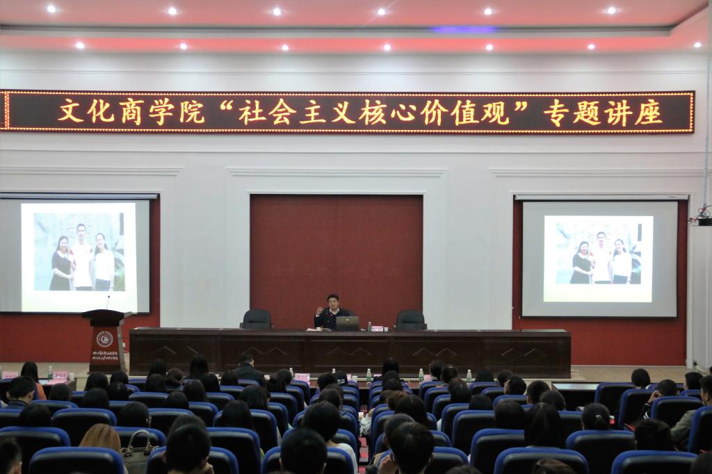 近日,我校副院长曹启富在第二教学楼105教室为文化商学院师生作“大学生如何践行社会主义核心价值观”主题讲座。我校学生工作部副部长、校团委书记兰楠,文化商学院党总支副书记焦健,分团委副书记罗婷婷,学生科全体辅导员老师以及文化商学院大一、大二学生代表参加了本次讲座。