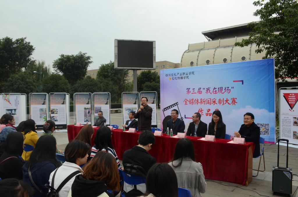 11月8日,文化传播学院第三届“我在现场”全媒体新闻采制大赛作品展暨颁奖仪式在艺体中心前广场举行。四川文化产业职业学院院长罗晓东、四川广播电视台记者张艺、校教务处负责人及师生代表参加了活动。颁奖仪式由文化传播学院副院长张学勤主持。