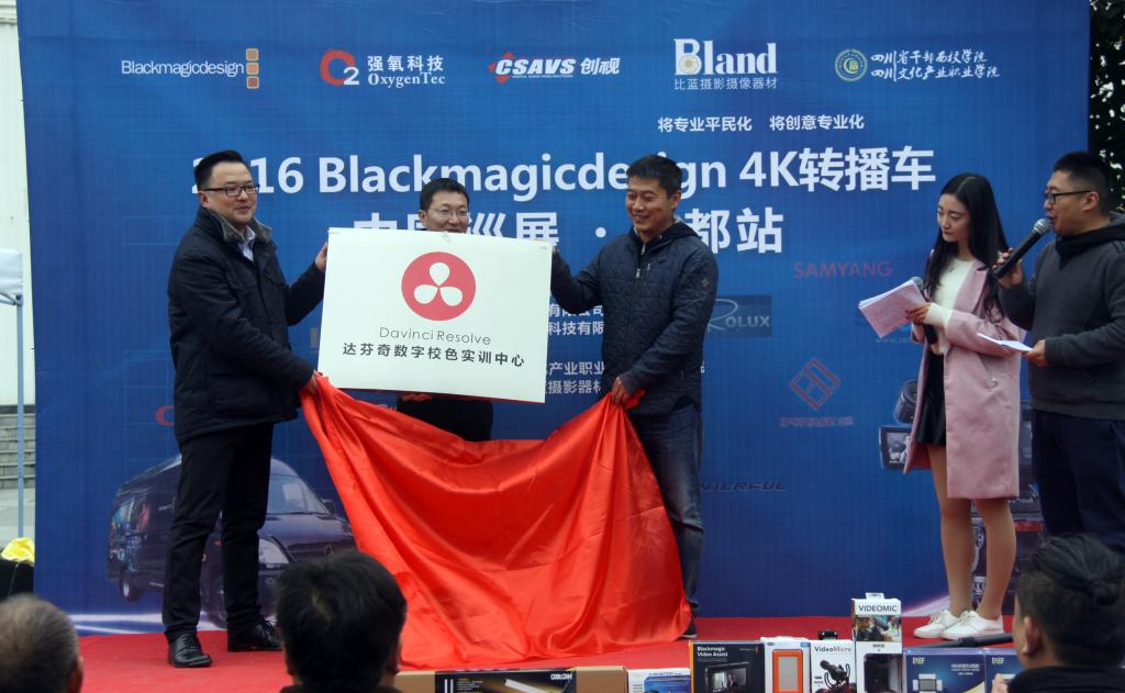活动中,校领导及各位嘉宾为微影像(DV)竞赛单元的获奖团队颁发证书、奖金及企业赞助的奖品。曹启富宣布“2016 Blackmagic Design 4K转播车中国巡展成都站”活动正式开幕。影视学院院长范欣和北京强氧科技教育总监何庆共同为在影视学院建立的西南地区首家“达芬奇校色实训中心”揭牌。