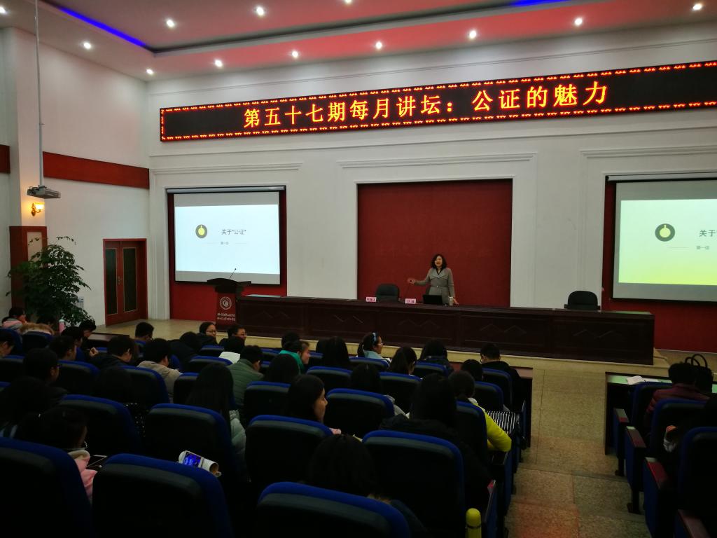 12月14日晚,在第二教学楼105多功能会议室,“四川省成都市律政公证处公证员,四川省公证协会理论研讨委员会委员刁姝女士做客我校第五十七期每月讲坛,为师生们带来了题为“公证的魅力”的专题讲座。