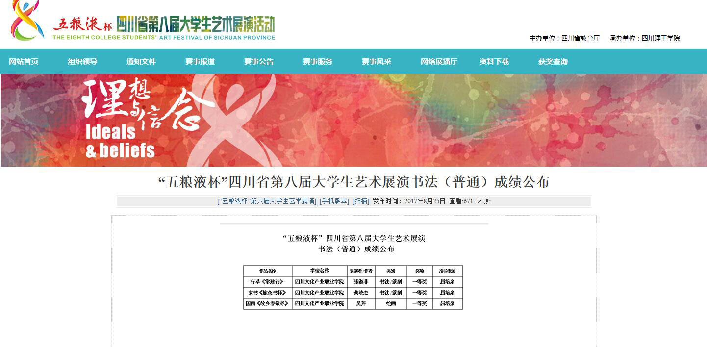 “‘五粮液杯’四川省第八届大学生艺术展演”活动由四川省教育厅主办,四川理工学院承办。动漫学院接到通知后,高度重视,确定由屈培泉老师牵头负责此项工作,共遴选出25件艺术设计和书画类作品参赛。