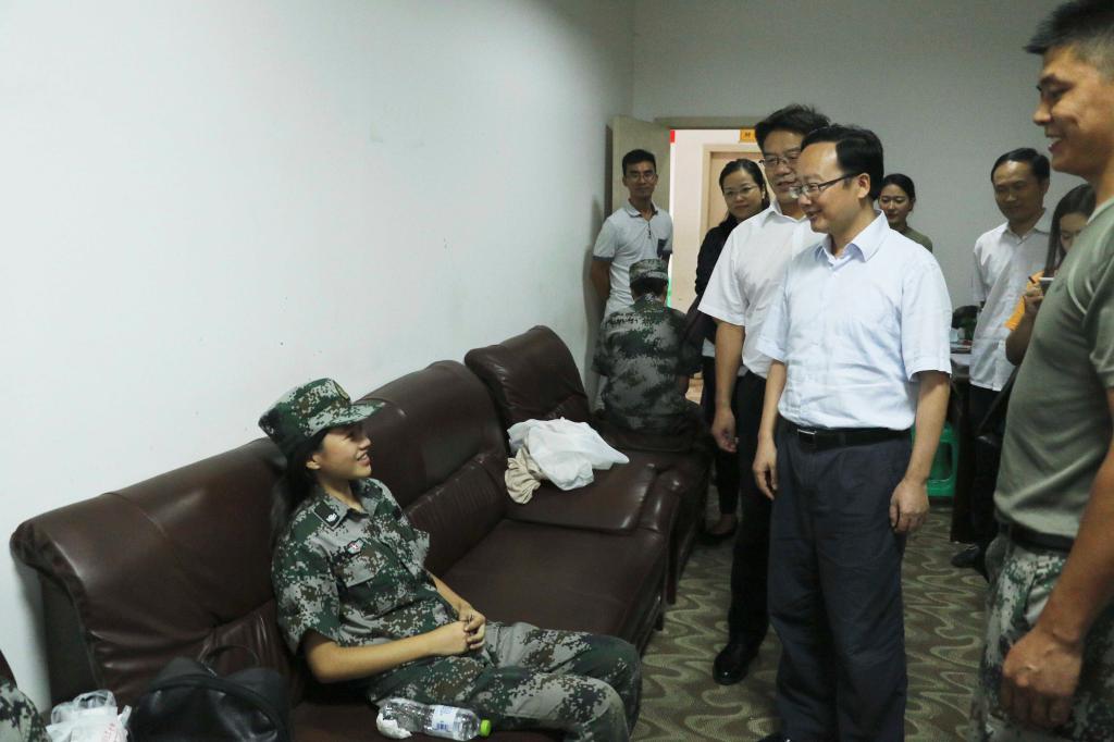 院长罗晓东一行先后视察了训练场地、寝室、医务室和食堂,并与军训基地负责人进行了交流。在医务室,罗晓东院长详细了解了今年受训新生的整体身体状况,对身体不适的同学进行了亲切叮嘱,同时鼓励新生们要像军人一样,用意志和毅力克服小困难,同时培养自己严明的组织纪律和勇敢顽强、坚韧不拔的优秀品质和优良作风。