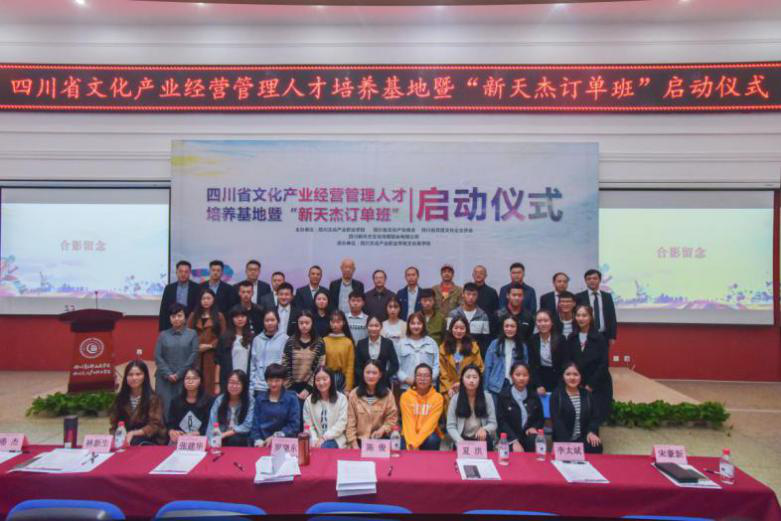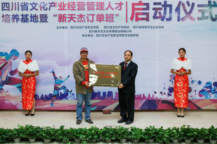 会上,夏洪向文化商学院授牌“四川省文化产业经营管理人才培养基地”。罗晓东和林新生共同为“新天杰订单班”揭牌。