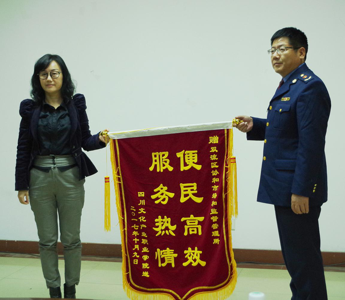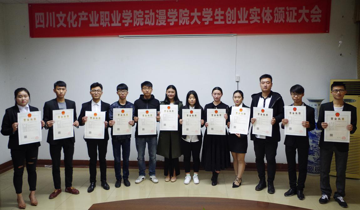 颁证会上,魏传兴为动漫学院12名大学生颁发了《个体工商户》营业执照。他分析了近几年大学生的创业趋势,鼓励同学们把握时代机遇,积极投身创业浪潮。徐昕介绍了双流区在服务青年创业、为创业保驾护航等方面开展的工作。创新创业学院院长薛英向双流区协和市监所赠送了锦旗。