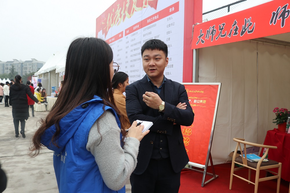 一批优秀校友也带着招聘岗位荣归母校,其中包括成都钻定一生珠宝有限公司总经理何剑,他是09级珠宝首饰工艺与鉴定专业毕业生。他在雅安白手起家,四年里用心经营,辛苦打拼,现已成功在多个城市共开设了23家加盟店。回到母校的他倍感荣幸,面对母校的变化他更是感到无限的欣喜。在展选会现场,他积极支招,希望学弟学妹们在大学期间认真学习专业技能,主动提升实践能力,培养吃苦耐劳的工作精神,一切从小事做起,保持心态,学会沉淀。