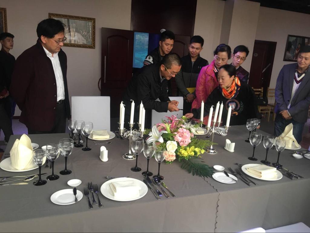 酒店管理和旅游管理专业的学生依次进行了中餐宴会摆台、西餐宴会摆台、盖碗茶茶艺、餐巾折花、导游景点讲解等专业技能展示,相关专业教师作了现场点评。