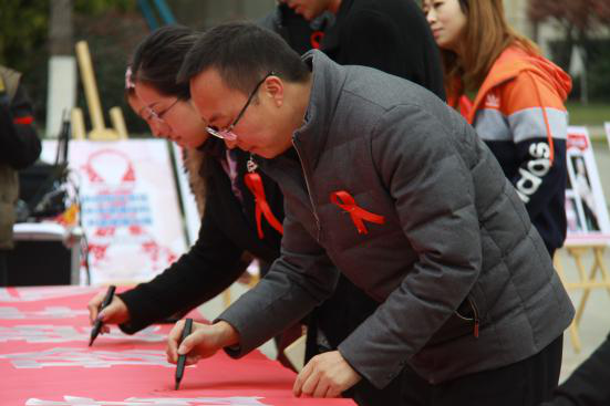 副院长何强及参与师生纷纷在“珍爱生命 预防艾滋”的横幅上签名留言,志愿者们还进行了防艾宣誓仪式,活动号召大家积极成为抗击艾滋病的一员,主动了解艾滋病的相关知识,提高自我保护能力,向零新增感染、零歧视和零死亡迈进,为有效预防和遏制艾滋病的蔓延、促进社会和谐贡献青春力量。