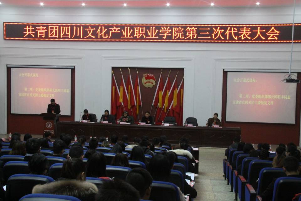 党委组织部部长邱明丰宣读了省直机关团工委《关于同意召开共青团四川文化产业职业学院第三次代表大会的批复》。纪委办公室副主任(监察处副处长)全威强调了换届选举纪律要求。大会审议并通过了主席团及秘书长建议名单、上届委员会工作报告、选举办法以及下一届委员会委员候选人建议名单,选举产生第三届团委会书记、副书记及委员。