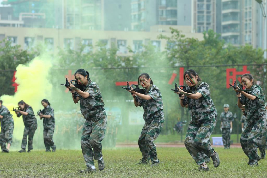 2019级参训新生们早早地以挺拔的军姿,整齐队列站立在足球场,严阵以待。9点30分,汇报表演正式开始,首先是走分列式,各二级学院新生组成不同的方队,在庄严的《中国人民解放军军歌》声中,带着坚毅的眼神,迈着坚定的步伐,缓缓走向主席台,口号响亮,斗志昂扬,步履排山。应急棍术方队、女子匕首操方队气势十足,女子战术方队动作完美规范,擒拿拳、三防演示、手语操等项目充分展现了新生们的军训成果。15天的军训生涯,让2019级新生的身心完成了质的蜕变,军训的结束是他们大学生活的开始,也是人生新的起点,他们将带着军旅精神,在文产院开始新的学习生活,绽放青春。