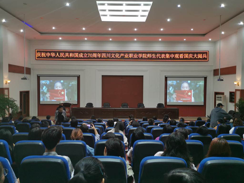 国庆佳节的文产校园,身披红装,洋溢着喜庆。在二教105多功能厅,在学校明慧楼、食堂、公寓和各值班点,在太平洋影城王府井店8楼4厅,当国歌奏响,我校师生热泪盈眶、情绪高昂、激情澎湃、共同高歌。校党委委员、副院长肖必恒与师生们共同观看庆祝大会电视直播。