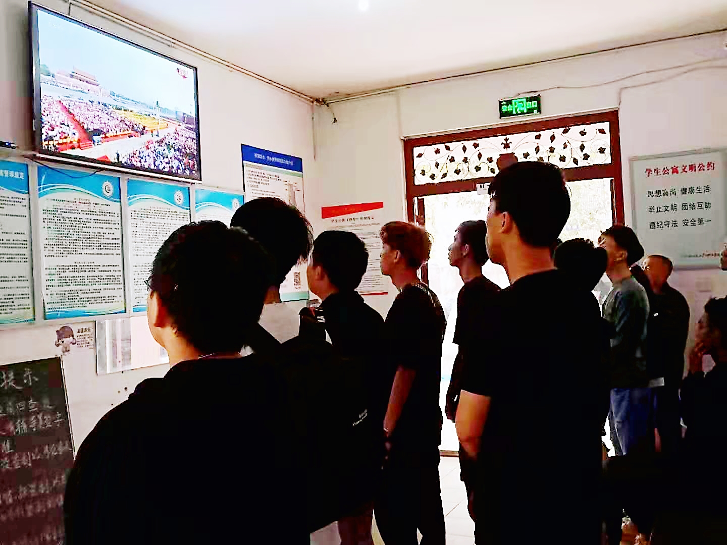当时钟从1949摆向2019,庆祝大会正式开始。当70响礼炮响彻云霄,当五星红旗迎风飘扬,当1949和2019的阅兵车牌号出现在视野,当习总书记依次检阅军容严整、军威雄壮、英姿勃发的受阅部队,当看见老一辈党和国家领导、军队领导、老一辈建设者和家属代表、新中国成立前参加革命工作的老战士、老一辈军队退役英模、民兵英模和支前模范代表时,全体师生多次响起热烈掌声;当“同心共筑中国梦”70辆流光溢彩的各类智能、绿色、环保彩车一一亮相时,师生们欢呼雀跃、激情满怀,民族自信心和民族自豪感瞬间点燃,师生们为身处新时代而自豪,被燃爆全场的史上最大规模的阅兵仪式而震撼,为伟大祖国所取得的辉煌成就而骄傲。