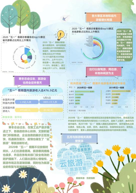 为了充分展示我校教赛结合、以赛促教、赛训结合,注重学生专业技能培养的教学特色,我校文传学院组建了由黄妍、蔡日祥、汪奂谦组成的指导教师团队,指导学生重点着手信息可视化和纪录片两个项目类别的作品筹备,共推荐10支队伍参加省赛。由于我校推荐作品将技术前沿与专业应用相结合、贴合实际、创意新颖,获得评委一致认可。其中,一等奖获奖作品《疫情下旅游情况分析报告》(作者巫丽姿,指导教师蔡日祥、汪奂谦),作者结合当下疫情形势,通过整理、分析“五一”假期相关旅游数据,以直观的数据图谱展示2020年“五一”前后旅游情况的变化趋势和疫情催生出的旅游新形式。
