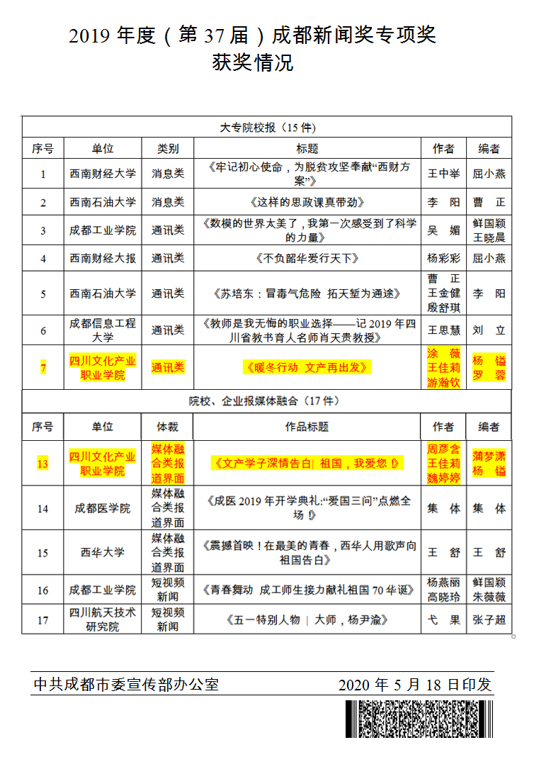 据了解,由省直机关工委颁发的“省直部门宣传信息工作先进单位”是我校连续第二年获此殊荣。校报106期作品《暖冬行动 文产再出发》获得中共成都市委宣传部、成都市新闻工作者协会颁发的成都市新闻奖“大专院校报—通讯类专项奖”,这是我校连续第三年获此荣誉;官方微信推文《文产学子深情告白| 祖国,我爱您!》荣获成都市新闻奖“媒体融合类报道界面专项奖”,是我校官方微信荣获的首次嘉奖。我校是本届成都市新闻奖获奖单位中的唯一一所高职院校。