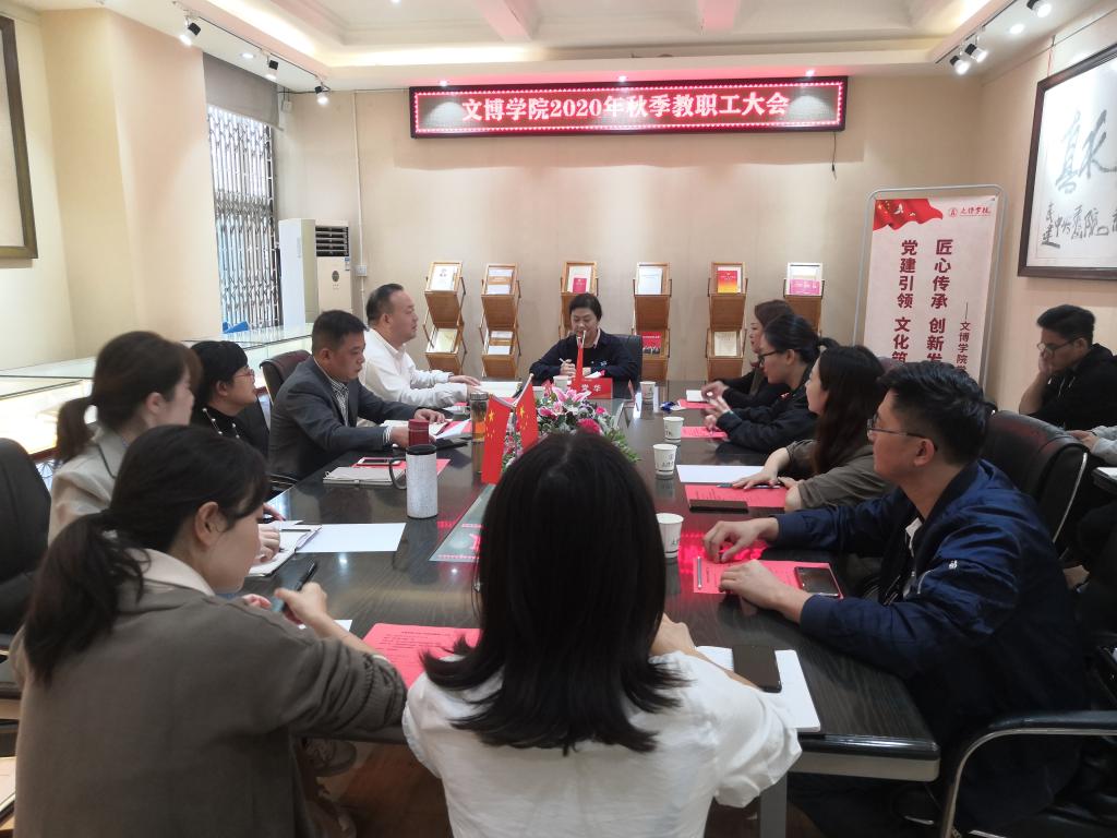 9月27日上午,文博学院在创慧楼二楼创一阁召开2020年秋季教职工大会,四川文化产业职业学院党委副书记、纪委书记党华出席会议,文博学院党总支副书记糜娜、副院长陈其余与文博学院全体教职工参会。会议由文博学院院长岳湛主持。