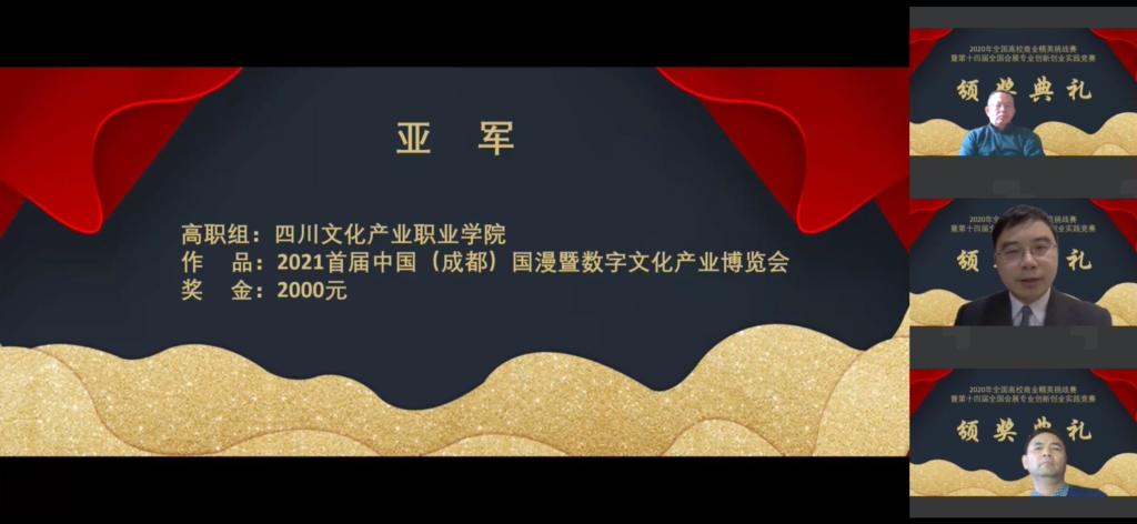 由青俊成等5名学生组成的“天魁星”团队,以作品《2021首届中国(成都)国漫暨数字文化产业博览会》,从281支队伍中层层过关,进入前十,挺进决赛;通过现场讲解、答辩,最终斩获全国高职组亚军。张江等学生组成的“赤脚追光”团队,以作品《2021首届中国(成都)国际儿童保护暨儿童产业博览会》荣获策划类一等奖,这也是我校连续五年蝉联大赛策划类一等奖。黄永虹等学生组成的“Team C”团队,以作品《成渝经济圈城市整合营销策划案》获得城市营销类一等奖。我校教师曾兴、贺博、苗雨蓝、唐思琪获最佳指导教师奖,我校获最佳组织院校奖。