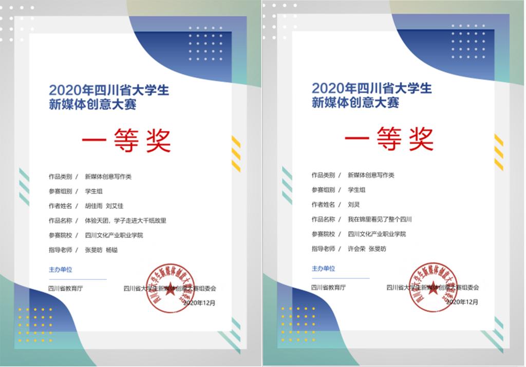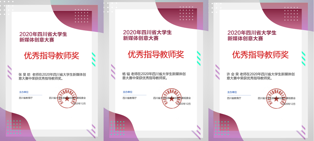 近日,我校师生在2020年首届四川省大学生新媒体创意大赛中荣获多个奖项,其中参赛学生获得一等奖2项,二等奖3项,三等奖15项,张旻昉、杨镒、许会荣三位老师荣获优秀指导奖。