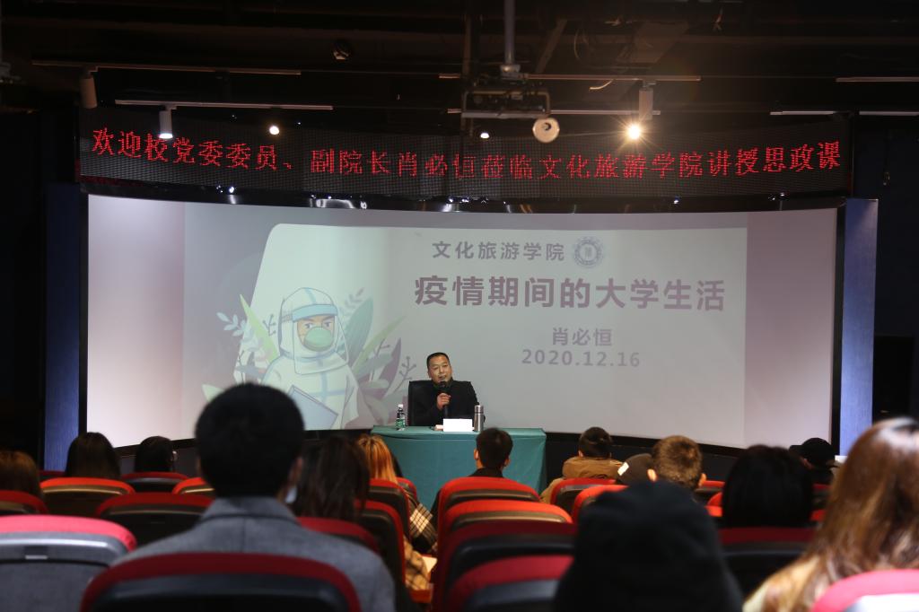 12月16日下午,校党委委员、副院长肖必恒在图书馆八楼环幕厅为文化旅游学院学生讲授抗击疫情专题思政课。