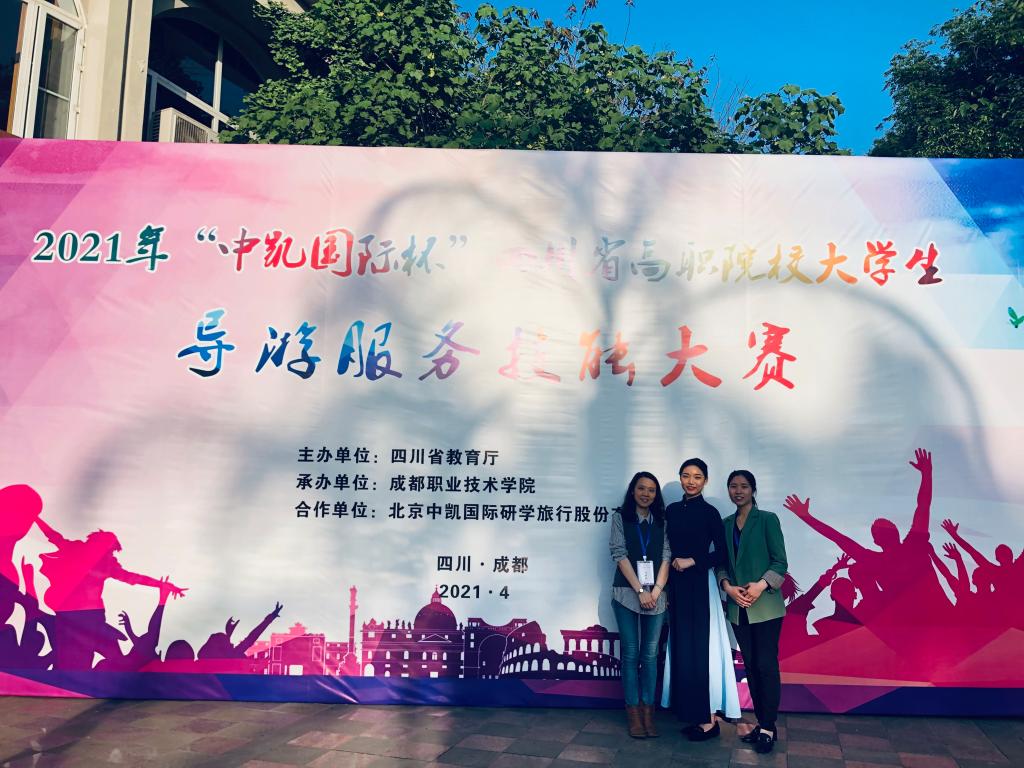 4月29日,由四川省教育厅主办的2021年“中凯杯”四川省职业院校导游服务技能大赛在成都职业技术学院花源校区举行,来自全省37所高职院校参加了比赛。我校文化旅游学院旅游管理专业学生代露雨以总分第二名的成绩斩获一等奖,黎玲、刘少林、唐思琪获“优秀指导教师”。