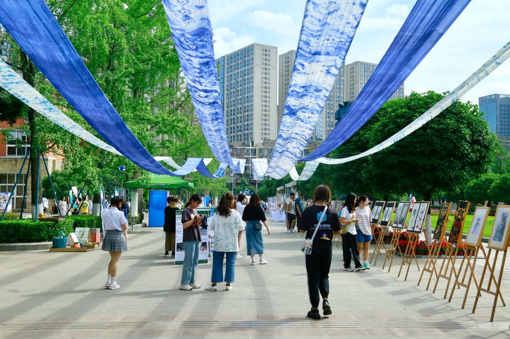 本次设计联展上,共展出了环境艺术设计、艺术设计、建筑动画与模型制作和广告设计与制作专业的部分优秀毕业设计作品和优秀课程作业作品400余件。许多原创文创产品,创意新颖,独具特色,让许多观者爱不释手,尤其是环境艺术设计专业同学精心制作的六幅各有100米的扎染作品,横亘在展览的上空尉为壮观,引得许多师生驻足观看并留影纪念。