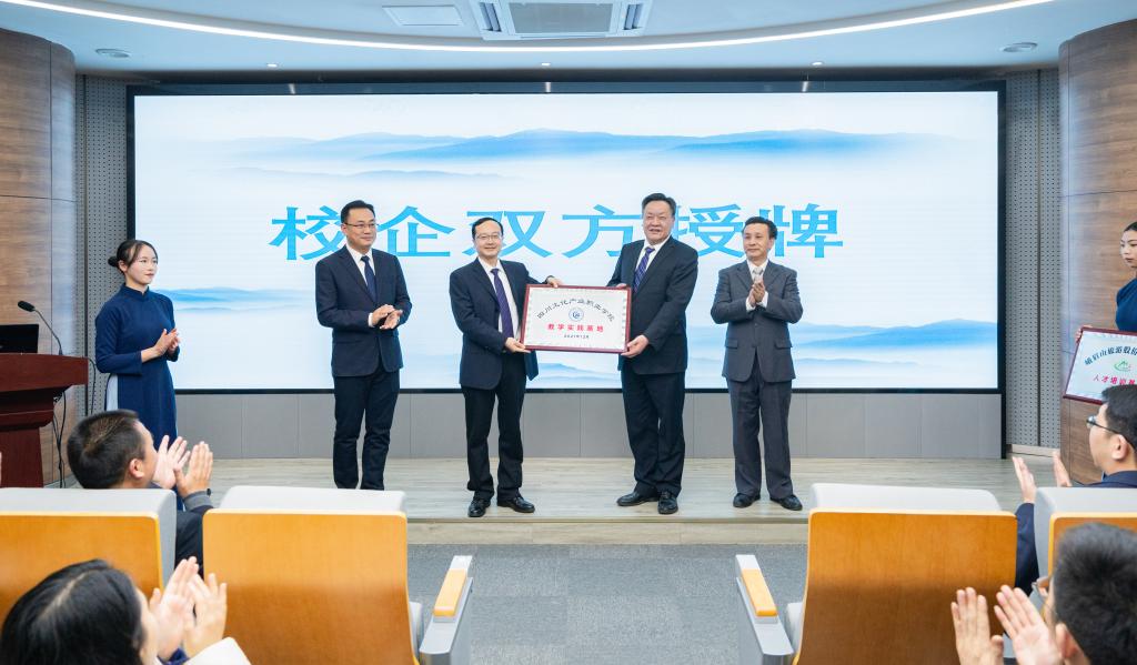 肖必恒副院长与陈德全总经理共同签订了校企合作协议。罗晓东与王东互授“四川文化产业职业学院教学实践基地”和“峨眉山旅游股份有限公司人才培养基地”的牌匾。