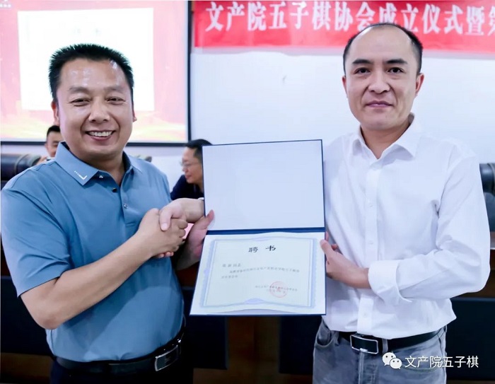 6月7日,四川省首家高校五子棋协会——文产院五子棋协会正式成立。校党委委员、副院长、工会主席肖必恒,校党委委员、副院长朱霖到场祝贺。校工会常务副主席李远君为五子棋协会会长沈醉授旗,肖必恒向协会名誉会长、国家体育荣誉奖章、国家体育一级奖章获得者、四川(成都)五子棋队主教练陈新颁发聘书。