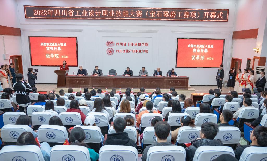 10月28-29日,由四川省人力资源与社会保障厅、四川省总工会、四川省工业合作联社主办。四川文化产业职业学院承办2022年四川省工业设计职业技能大赛(宝石琢磨工赛项)暨第二届全国工业设计职业技能大赛四川选拔赛开幕。四川文化产业职业学院党委委员、副院长李太斌,教务处处长向天华,成都市双流区人社局副局长裴革琼,大赛专家组组长孙仲鸣教授,大赛裁判长张晓晖教授,裁判员杨听、崔东山,大赛监督组组长陈泓雨博士,四川文化艺术学院、成都理工大学、都江堰职业中学、四川文化产业职业学院以及珠宝行业企业代表中选拔出入围本次总决赛20名选手代表,以及来自北京,湖北,安徽,浙江的多位国赛专家、文产院师生200余人参加开幕式。