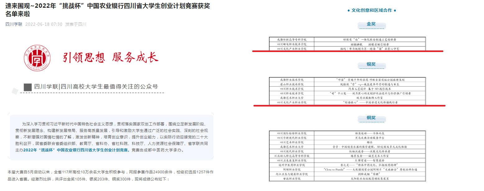 6月18日晚,2022年“挑战杯”四川省大学生创业计划竞赛决赛评选结果揭晓。经过校级评选推报、省级网络评审和省级决赛多轮比拼,我校在本次竞赛中取得一金两银的好成绩,又一次实现我校大学生双创赛事成绩的突破。