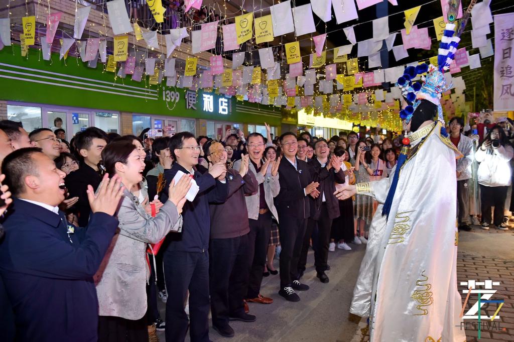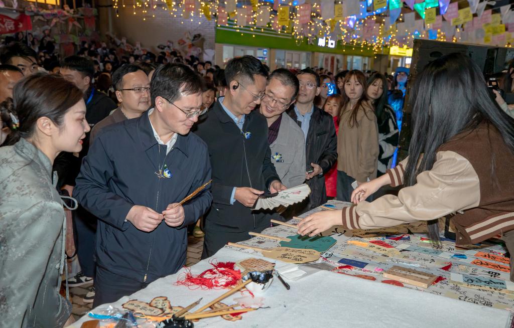 特邀表演嘉宾的古典舞与汉服将气氛推向高潮,上千名师生沿街观看。街区沿路设置了非遗体验区、艺术体验区、潮酷表演区、互动游戏区,供嘉宾和师生现场体验。吹糖人、剪纸、面人、棕编、糖画等非遗传统文化摊位被围得水泄不通;陶艺扎染、川剧变脸、茶艺表演等艺术体验吸引了大量参与者;真人汉服游行、乐队街舞、演唱诵读、魔术杂技气氛热闹;投壶、飞花令、鲁班锁等互动游戏为大家带来了极具氛围的沉浸式体验。