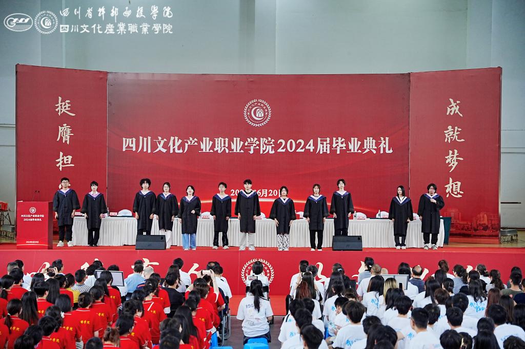 毕业生辛格同学代表全体毕业生感谢母校师长的教诲之情,号召全体毕业生要不忘校训、不忘校恩,牢记师情,以美丽心灵创造美好未来。校友(2014级汉语言文学专业学生)宋飞扬在毕业典礼上分享了他与文产的青春故事和自己孜孜不倦的求学路,他鼓励学弟学妹们在时代的滚滚洪流中,秉飞天之志,驾扬帆之航,乘风破浪,勇毅前行。教师黎玲勉励毕业生们鼓足勇气,在未来的日子里要心中有梦、眼里有光、脚下有路、径行直遂、青云万里!