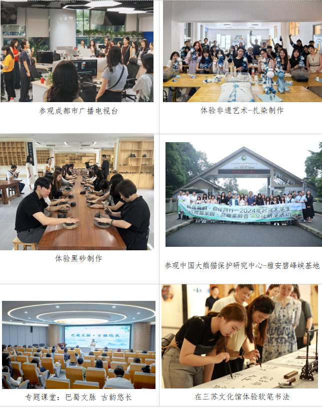 研习营一行在广汉三星堆探秘古蜀文明;在成都市广播电视台、博拉青聚数创(成都)科技有限公司沉浸式感受行业科技发展动态;在润泽天府的都江堰感悟先民的智慧、坚忍与工匠精神;聆听巴蜀文化讲座,激发中华文化之共鸣;亲手体验扎染、竹编、拓印、黑砂陶器制作等特色活动,领略非遗之美;参访眉山中国泡菜城博物馆、中国·雅安大数据产业园、雅安茶厂;在雅安碧峰峡中国大熊猫保护研究中心与大熊猫亲密接触......饱览天府之国独特秀丽的自然风光,品味四川深厚的历史文化底蕴,同学们深度体验了中华传统文化在新时代的魅力,感受到了中国式现代化发展的时代脉搏。
