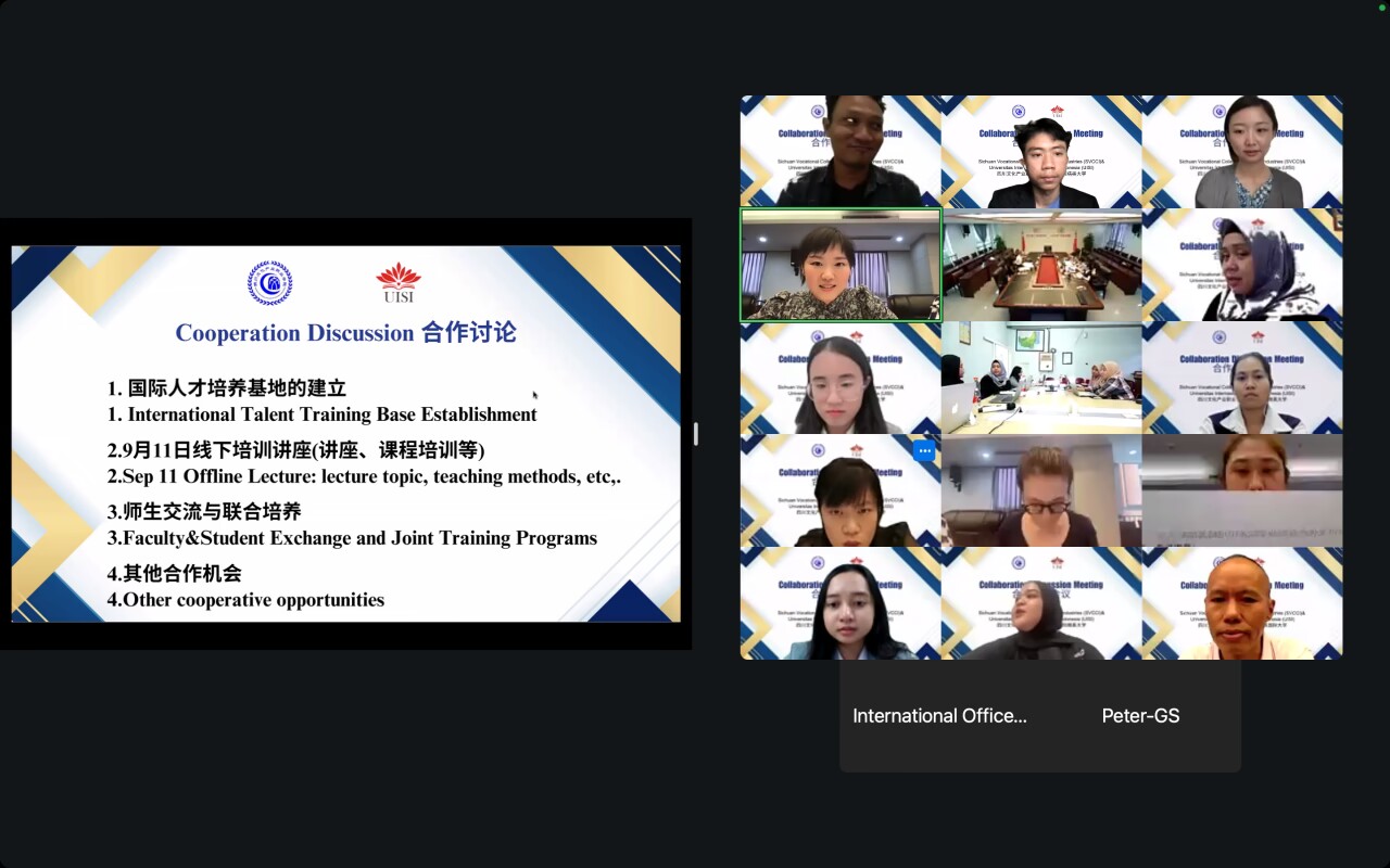 会上,双方围绕办学理念、优势专业、国际项目等方面介绍了各自学校的基本情况,就共建中国-东盟融媒体技术人才培训基地、线下培训讲座、师生交流与联合培养等项目合作深入交流,并达成初步共识。印尼精英国际大学国际处主任鲁斯蒂卡莎莉·努格拉赫尼女士表示,非常期待与四川文化产业职业学院在课程平台共建、联合科研、师生互访、技能培训、人才培养等多个方面展开深入合作。双方将在9月线下会晤中继续共同探索和推动具体的合作项目。