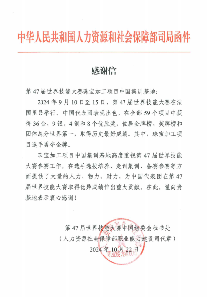 近日,第47届世界技能大赛中国组委会(人力资源和社会保障部)向学校发来感谢信,对学校在第47届世界技能大赛珠宝加工项目中国集训基地的工作给予充分肯定。对在选手选拔培养、走训集训、备赛参赛等方面提供了大量的人力、物力、财力,为中国代表团在第47届世界技能大赛取得优异成绩作出重大贡献表示感谢。