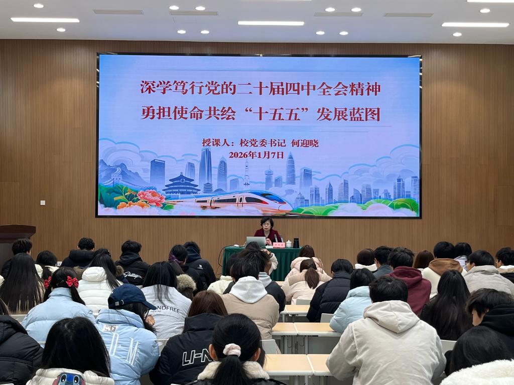2026年1月7日,校党委书记何迎晓以“深学笃行党的二十届四中全会精神勇担使命共绘‘十五五’发展蓝图”为题,为大一学生讲授形势与政策课。对我国五年规划(计划)的发展历程进行历史回溯,深入解读“十五五”规划的核心要义,并对青年学生如何将个人理想融入国家发展大局提出殷切期望。鼓励同学们坚定理想、融入时代大潮,用实际行动书写青年一代的精彩华章。