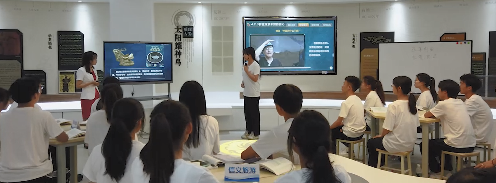 依托四川巴蜀文化数字研究基地,打造沉浸式思政第二课堂。基地集中展示古蜀文明、华夏始祖、古蜀人文历史,借助数字大屏生动诠释巴蜀地域文脉与文明底蕴。思政课教师充分用好学校独有文化资源,将巴蜀文脉内涵有机融入课程教学,转化为生动鲜活的思政教学素材。在常态化组织学生参观研学的基础上,引导学生开展文化品读、心得分享、主题研讨,让优秀地域文化入脑入心,以文化浸润滋养价值情怀,持续筑牢学生文化自信。