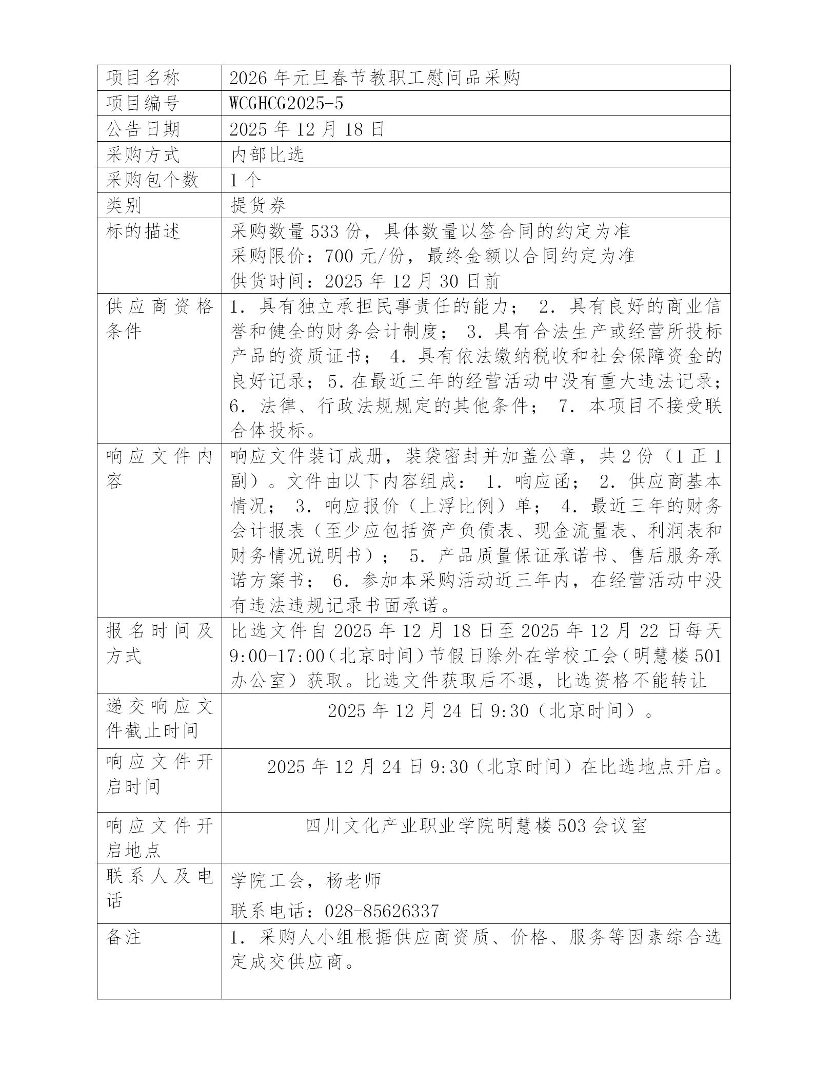 四川文化产业职业学院工会委员会2026年元旦春节教职工慰问品采购公告