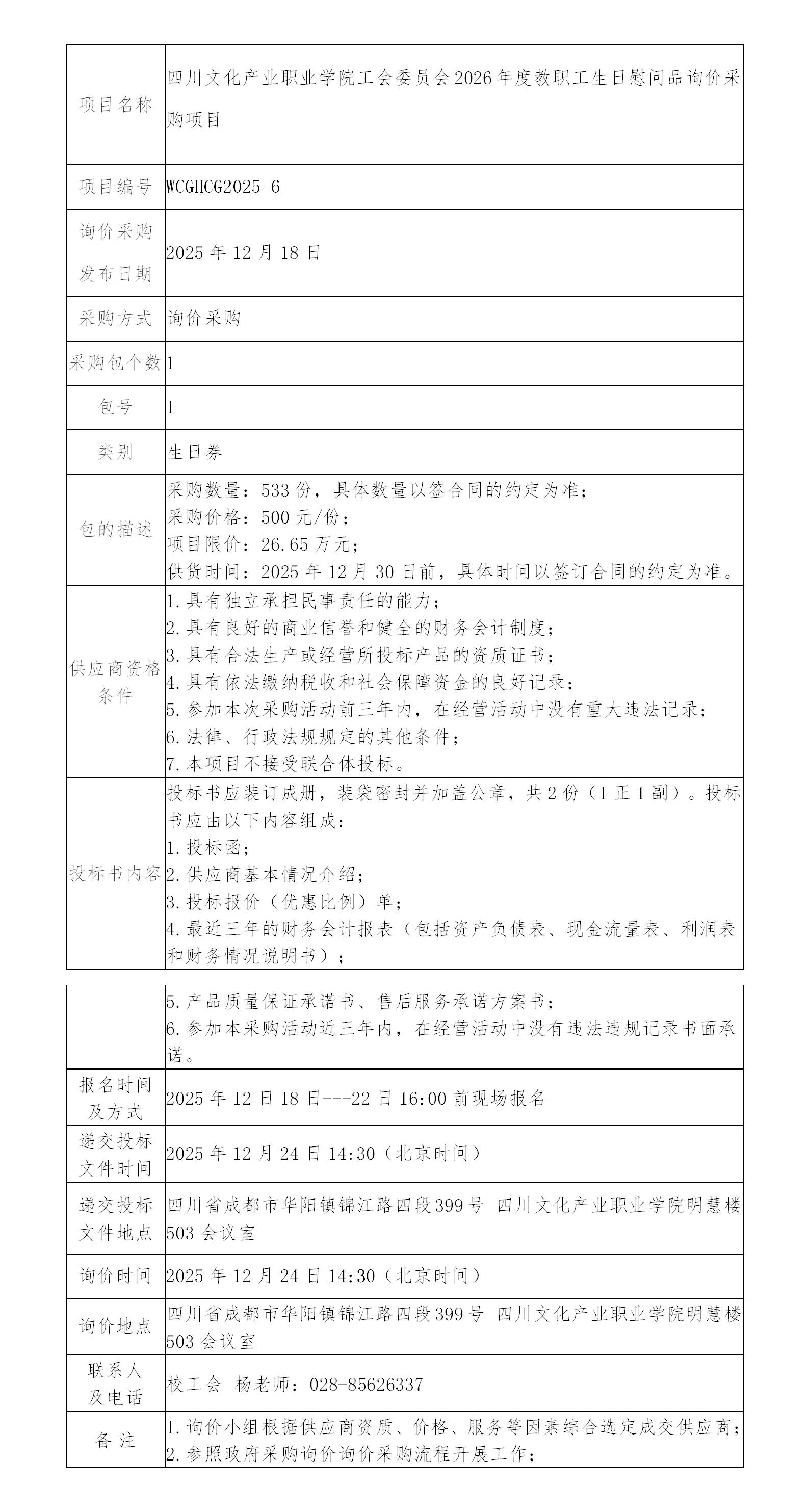 四川文化产业职业学院工会委员会2026年度教职工生日慰问品询价采购公告