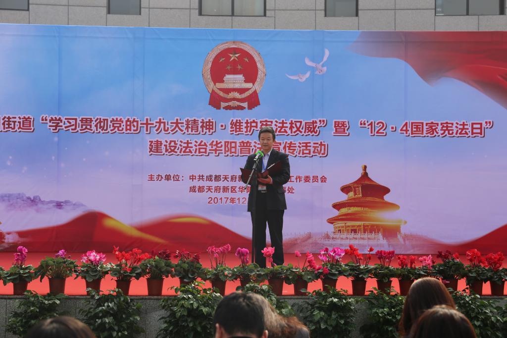 本次普法宣传活动由中共成都天府新区华阳街道工作委员会、成都天府新区华阳街道办事处主办,天府华阳、各社区协办,旨在进一步弘扬宪法精神,维护宪法权威,推动“七五”普法规划全面实施,推进华阳街道法治宣传教育工作,加强法治文化建设,弘扬法治精神,进一步调动市民参与法治文化宣教,建设美丽华阳,营造全社会遵法学法守法用法的良好氛围。活动受到了四川电视台、成都电视台等多家主流媒体关注报道。