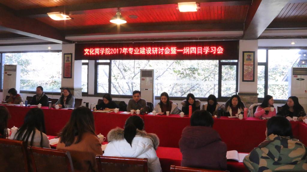 1月19日,为贯彻落实学校“十三五”时期加快教学内涵建设的任务要求,深刻领悟“一纲四目”等教学文件对专业的人才培养要求,文化商学院组织全体教职工举行了2017年专业教研总结会暨“一纲四目”学习会。院长宋晓、副院长邓颖颖、各专业负责人、全体专职教师、全体行政教辅人员参加学习活动。