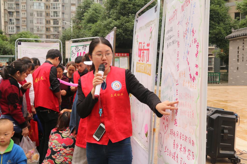 在志愿者布置完场地后,活动正式开始。参加活动的社区群众在志愿者们带领下有序地在签到墙上签到,并进行亲子合影,到场的小朋友都获得了志愿者们手工制作的贺卡与康乃馨等礼品,小朋友们在贺卡上写满祝福语和心里话送给妈妈,在场的每一位母亲与自己的家人相拥在一起,场面幸福温馨。随后组织的亲子游戏,让大家充满欢声笑语。