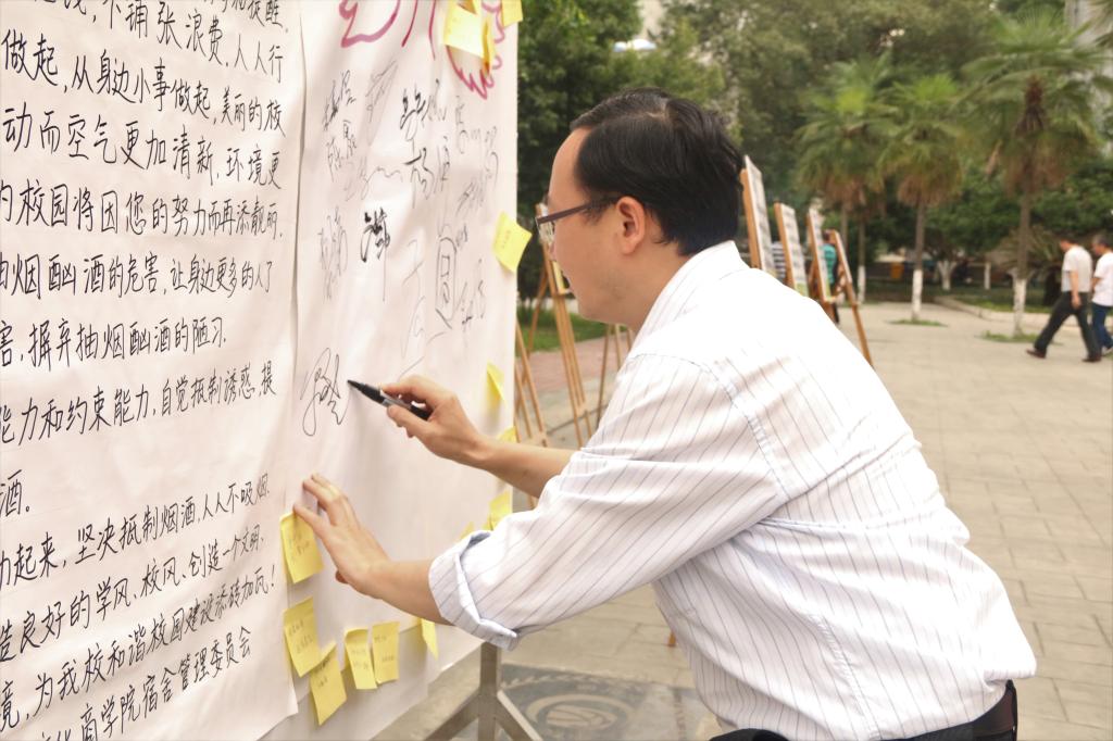 在第一食堂门口组织的签名活动中,院长罗晓东、副院长肖必恒及学工部副部长卢苇带头在宣传展板上签下自己的名字,支持活动的举办。随后,我校师生积极参加活动,在活动现场,组办方通过知识竞答的方式给同学们普及了香烟和酒精的危害,开展健康教育宣传,同时也向同学们普及了国家关于“公共场所禁止吸烟”的相关规定,引导大家对健康生活的追求。