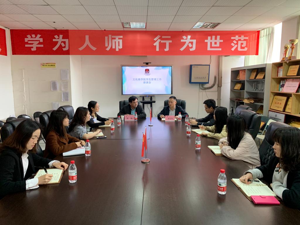 为落实党中央和省委省政府精准扶贫政策,扎实开展学生思想政治教育工作,提高我院日常管理水平,5月9日上午,四川省教育厅基础教学处副处长、成都西藏中学校长顾定华应邀莅临文化商学院座谈交流,并指导工作。座谈会在学校二教四楼会议室举行,会议由文化商学院院长宋晓主持,学生科全体老师参会。