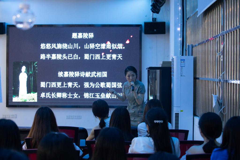 薛涛被誉为蜀中四大才女之一,在巴蜀文化史和唐代诗歌史上都有着重要的地位。在沙龙中,尹玉英老师将这位“女校书”传奇人生分为“迎鸟逢风一世孤”、“有名无实校书郎”、“独坐黄昏谁为伴”三个部分向师生们进行了介绍,并与师生们一同诵读了薛涛的代表诗作,引导师生通过这些诗歌为去解构特定历史背景下古代知识女性的女性意识。