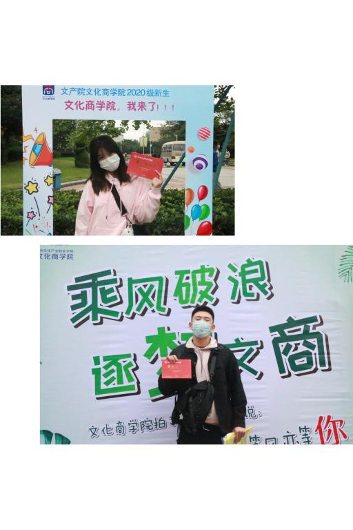 在迎新接待工作中,新同学在老师和志愿者的引导下,有条不紊地办理入学手续。在今年疫情防控的特殊时期,优化的报到流程和完善的细节安排让整个报到现场秩序井然,现场咨询、绿色通道、行李寄存、摆渡交通等周到服务温暖人心;新同学们少了家长的入校陪伴,更显独立、勇敢和自信。学院也营造了热情、温馨的迎新氛围,报到现场摆放的“乘风破浪,逐梦文商”“感恩遇‘商’,等风亦等你”主题喷绘和模拟朋友圈背景成为新同学们拍照留念的打卡热点。